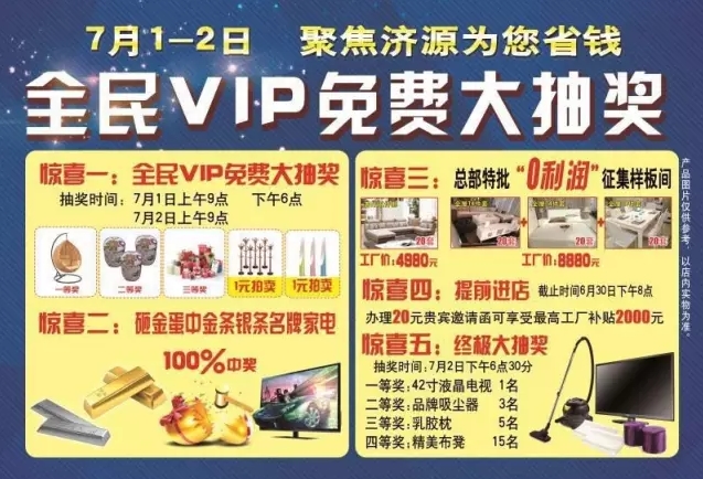驚喜1、全民VIP免費(fèi)大抽獎(jiǎng),休閑吊籃椅、皮凳等大獎(jiǎng)免費(fèi)抽。另有產(chǎn)品1元超值拍賣。